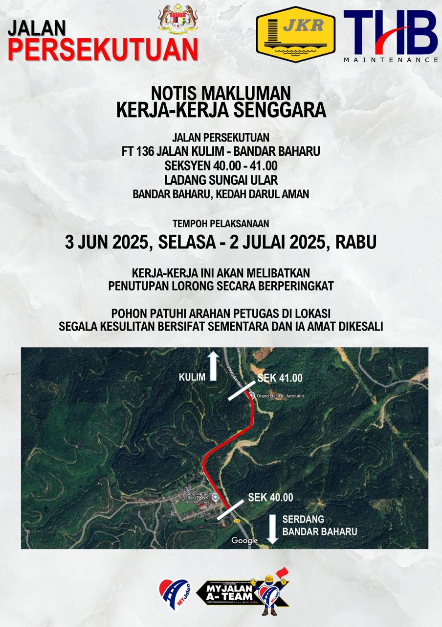 Kerja-kerja senggara Jalan Persekutuan FT 136 Jalan Kulim – Bandar Baharu Seksyen 40.00 – 41.00, Lokasi Ladang Sungai Ular, Bandar Baharu, Kedah.