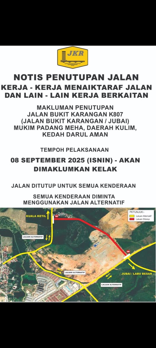 MAKLUMAN PENUTUPAN JALAN BUKIT KARANGAN K807 (JALAN BUKIT KARANGAN / JUBAI) MUKIM PADANG MEHA, DAERAH KULIM, KEDAH DARUL AMAN
