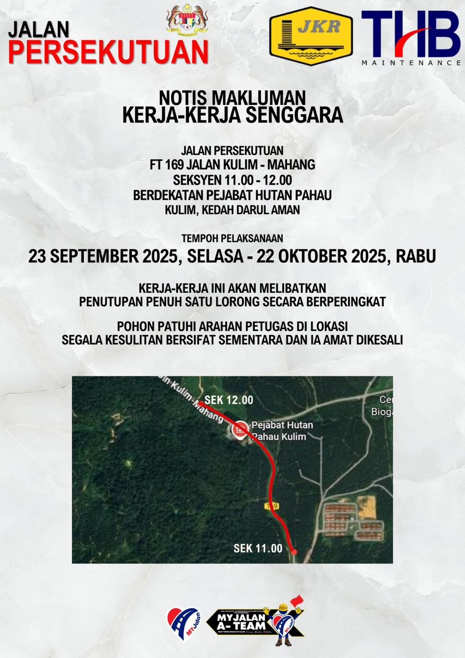 Kerja-kerja senggara Jalan Persekutuan FT 169 Jalan Kulim – Mahang seksyen 11.00 – 12.00, Lokasi berdekatan Pejabat Hutan Pahau, Kulim, Kedah.
