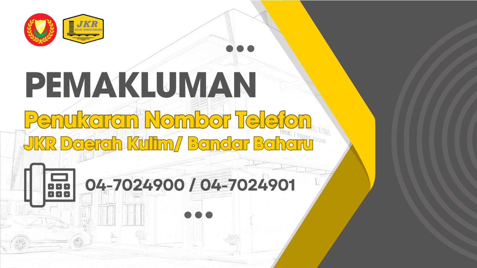 Sukacita dimaklumkan bahawa Jabatan Kerja Raya (JKR) Daerah Kulim/Bandar Baharu telah membuat penukaran nombor telefon pejabat bagi tujuan penambahbaikan perkhidmatan dan kemudahan komunikasi.