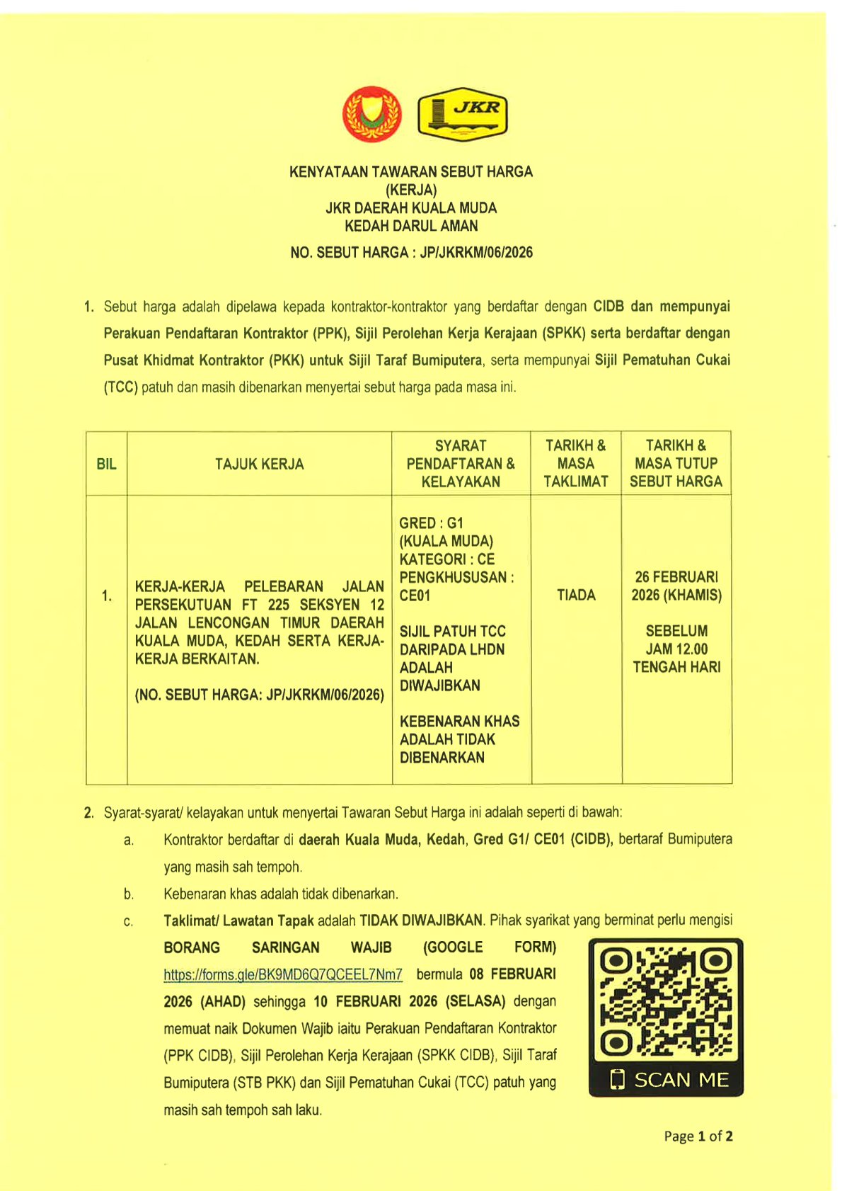 Kontraktor-kontraktor yang berdaftar dalam Gred G1 (Kuala Muda)/CE01 dan bertaraf Bumiputera serta mempunyai Sijil Patuh TCC dijemput untuk menyertai tawaran sebut harga ini berdasarkan syarat-syarat seperti di dalam KENYATAAN TAWARAN SEBUT HARGA.