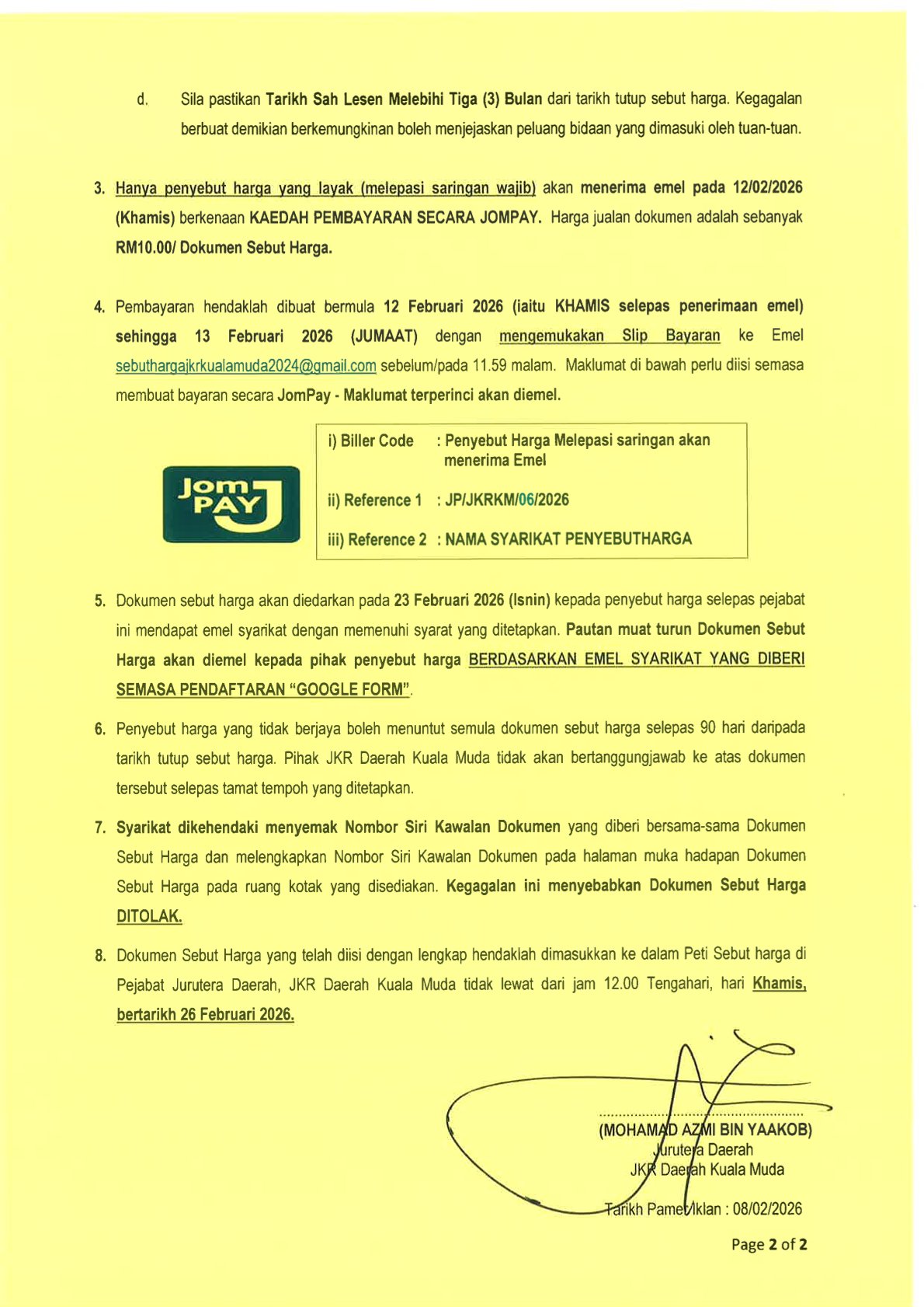 Taklimat/Lawatan Tapak adalah Tidak Diwajibkan. Pihak syarikat yang berminat perlu mengisi BORANG SARINGAN WAJIB (GOOGLE FORM) https://forms.gle/psDWuxtJ11EVZQiY9 bermula 08 Februari 2026 (Ahad) sehingga 10 Februari 2026 (Selasa).