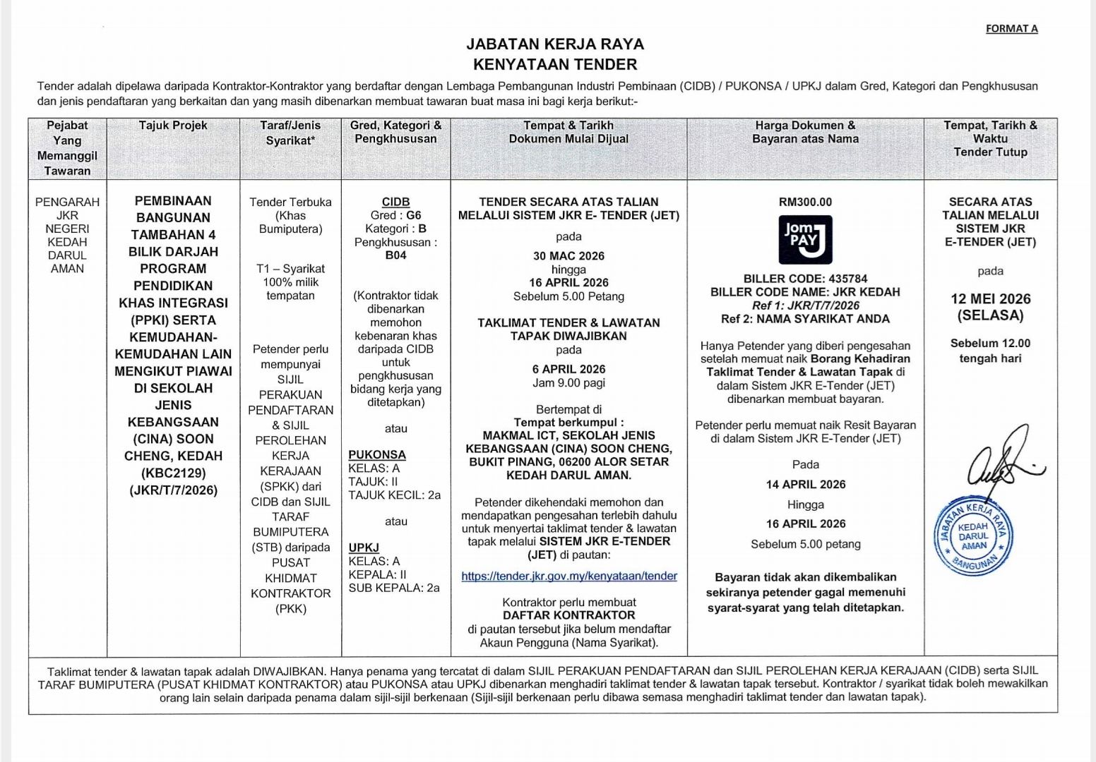 SILA LAYARI LAMAN SESAWANG JKR E-TENDERING (JET) UNTUK MAKLUMAT LANJUT.