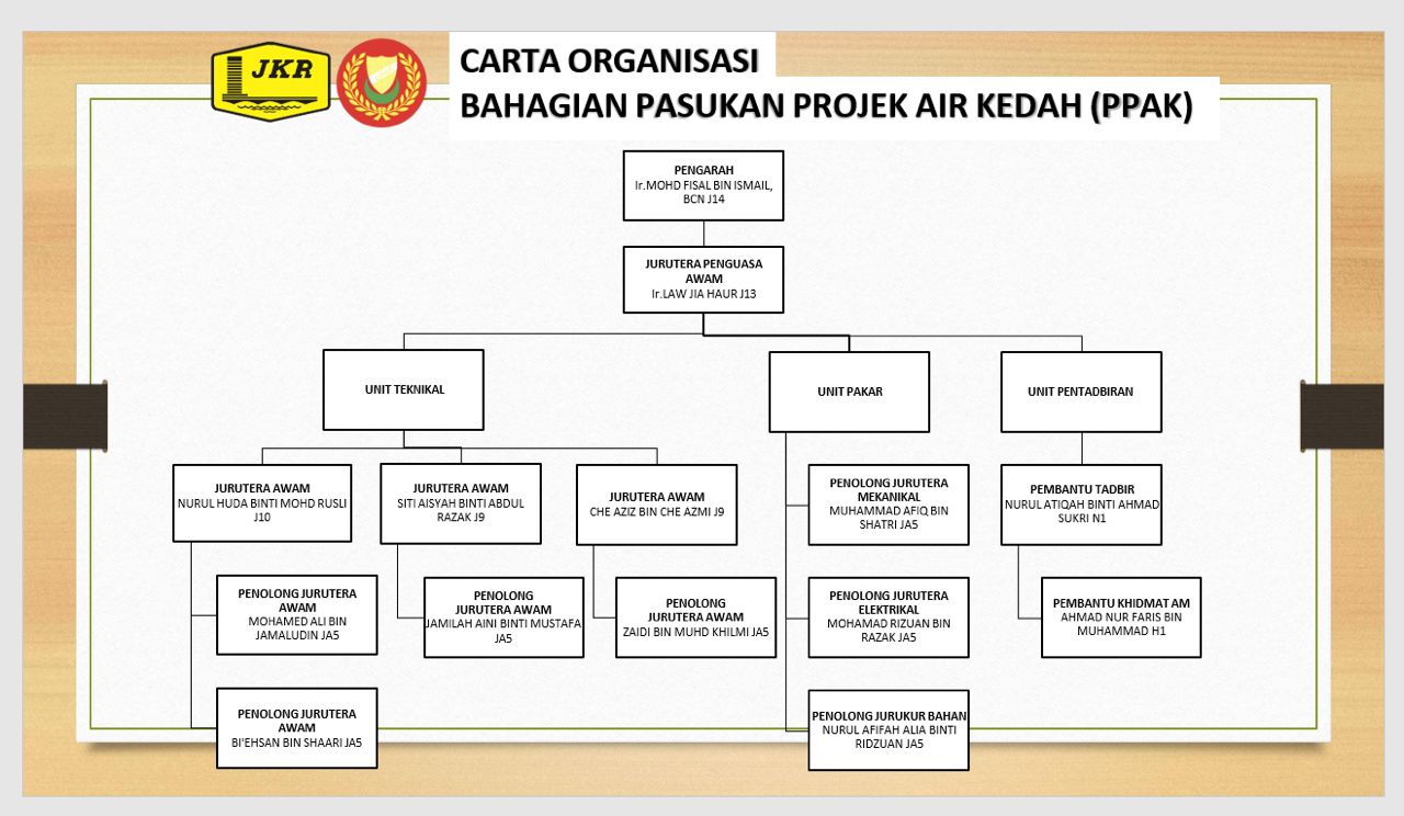 Pasukan Projek Air Kedah (PPAK) telah ditubuhkan pada tahun 2021 dan objektif penubuhan PPAK adalah mengukuhkan lagi kaedah atau mekanisme pemantauan Projek Loji Rawatan Air Negeri Kedah. PPAK merupakan sebuah unit teknikal Jabatan Kerja Raya Negeri Kedah yang berperanan sebagai Wakil Pegawai Penguasa yang bertanggungjawab menguruskan penyeliaan kerja pembinaan dan pentadbiran kontrak bagi Projek Pembangunan Air Negeri yang bernilai RM 939,647.932.00 serta bertanggungjawab melaporkan kepada Pengarah Negeri.