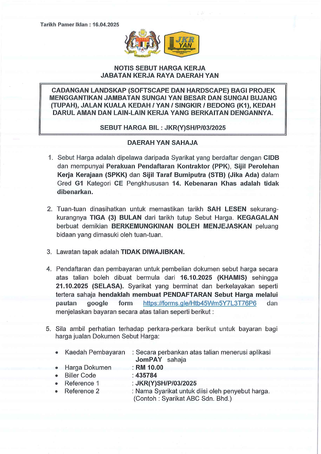 NO BIL. SEBUT HARGA : JKR(Y)SH/P/03/2025