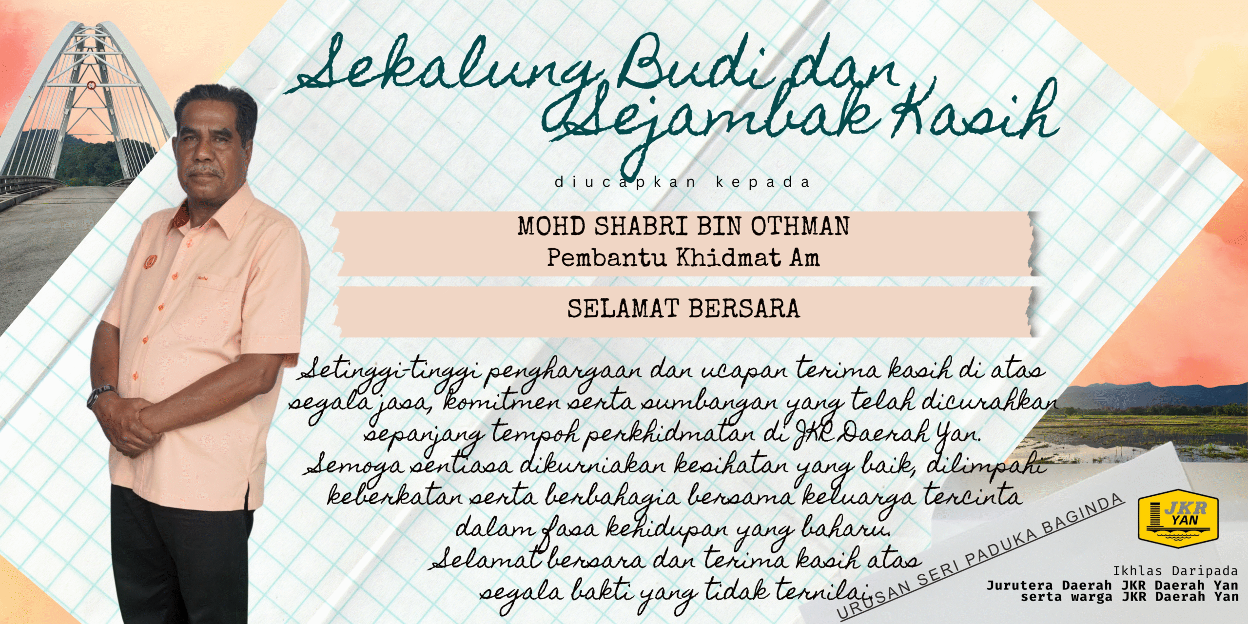 Jurutera Daerah serta warga JKR Daerah Yan mengambil kesempatan ini untuk merakamkan setinggi-tinggi penghargaan dan ucapan terima kasih atas segala jasa, komitmen serta sumbangan staf yang bersara sepanjang berkhidmat di jabatan ini.